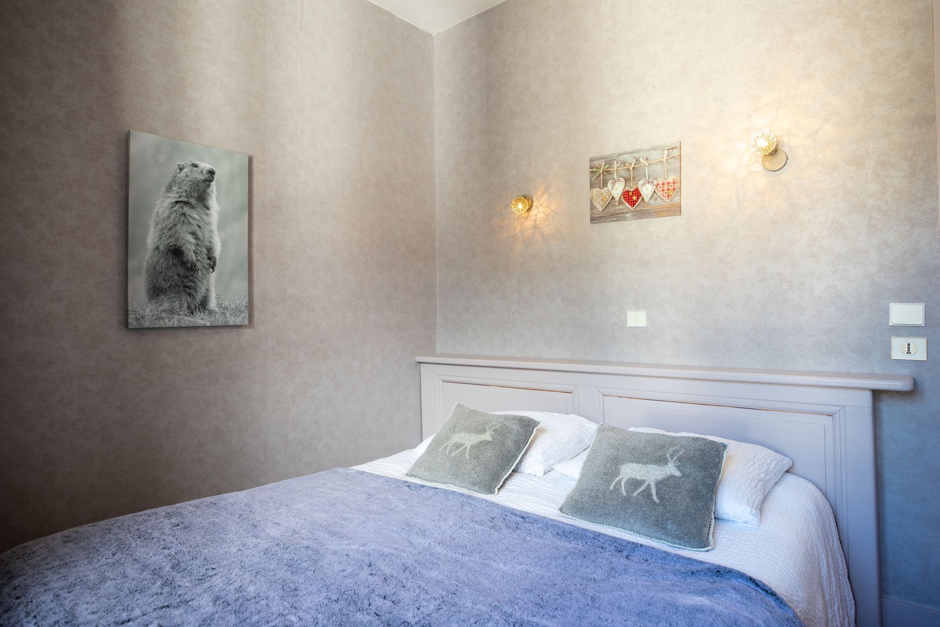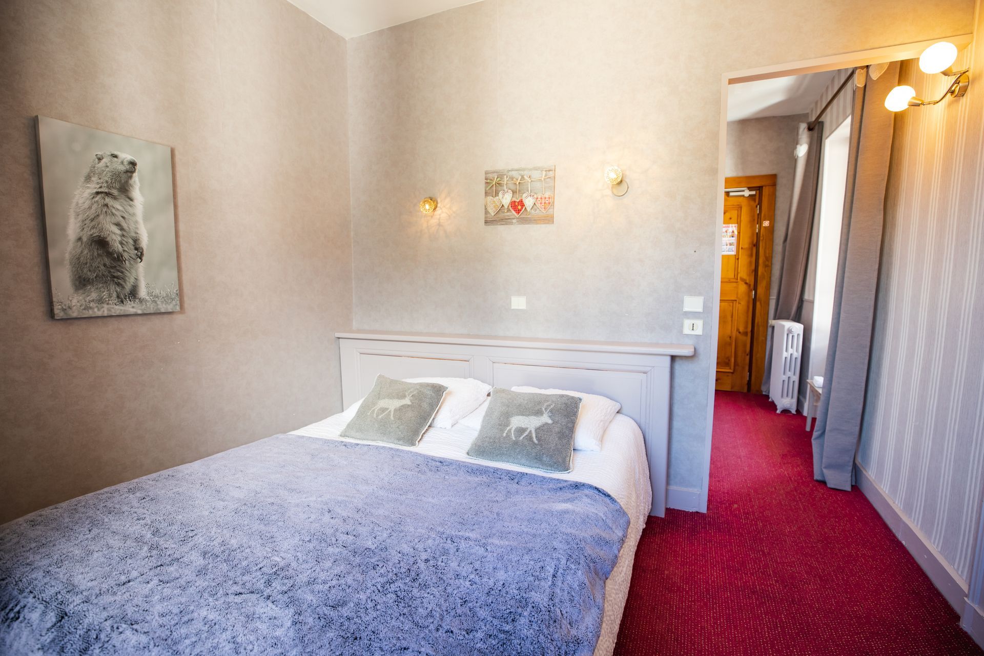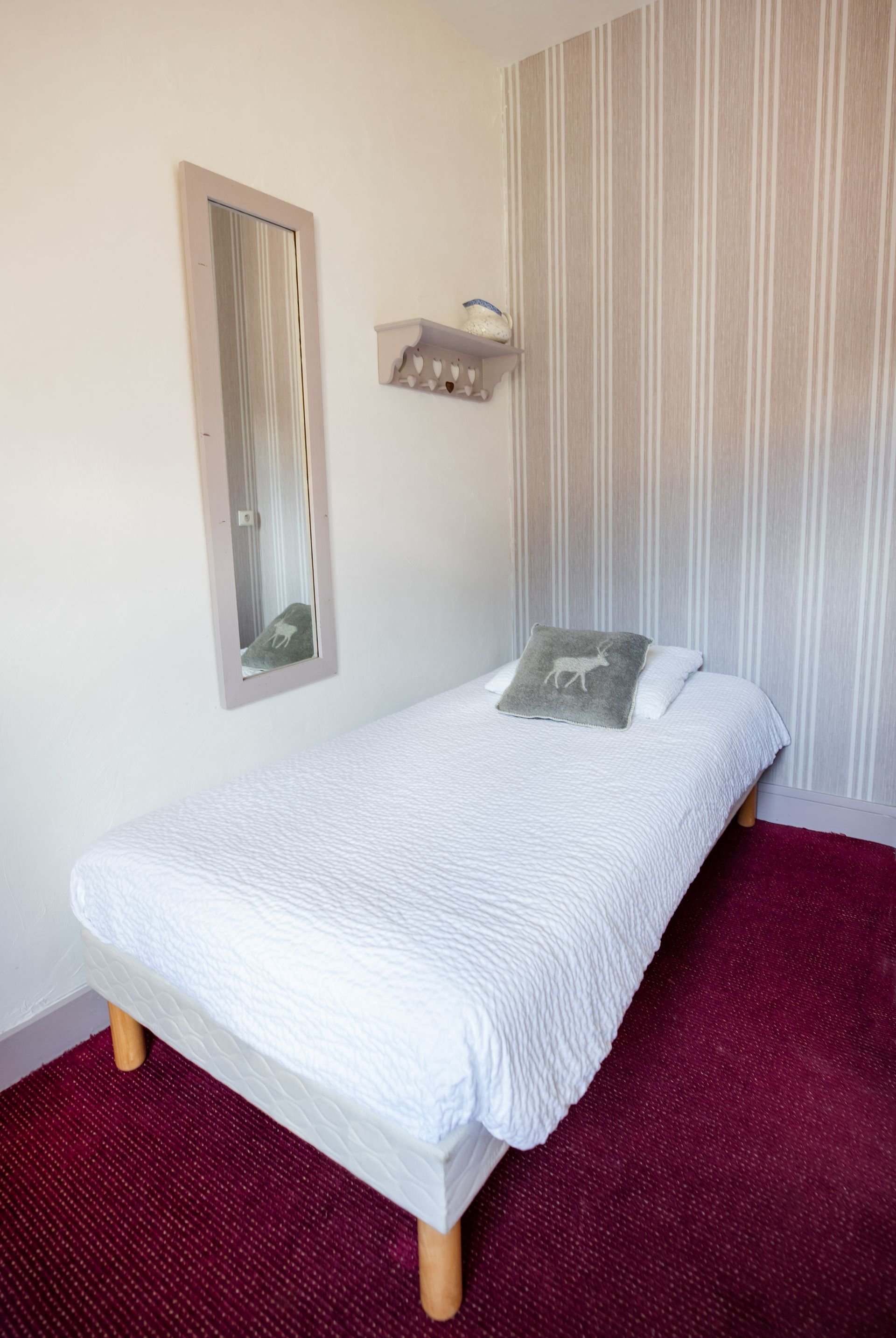 Un bain de lumière grâce à ses 2 fenêtres, une vue douce sur le clocher et les montagnes, un lit 90x190cm et un grand lit en 140x190 cm, une tranquillité grâce à la cloison qui sépare les 2 espaces.